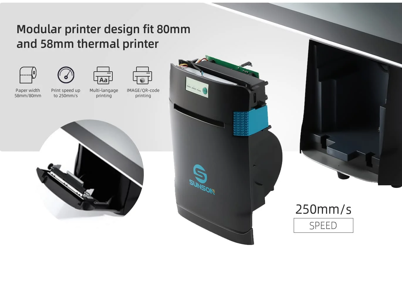 Máy in 80mm: Tốc độ in 250mm/giây, cuộn giấy tối đa 80*120mm, dao cắt nhập khẩu từ Nhật Bản